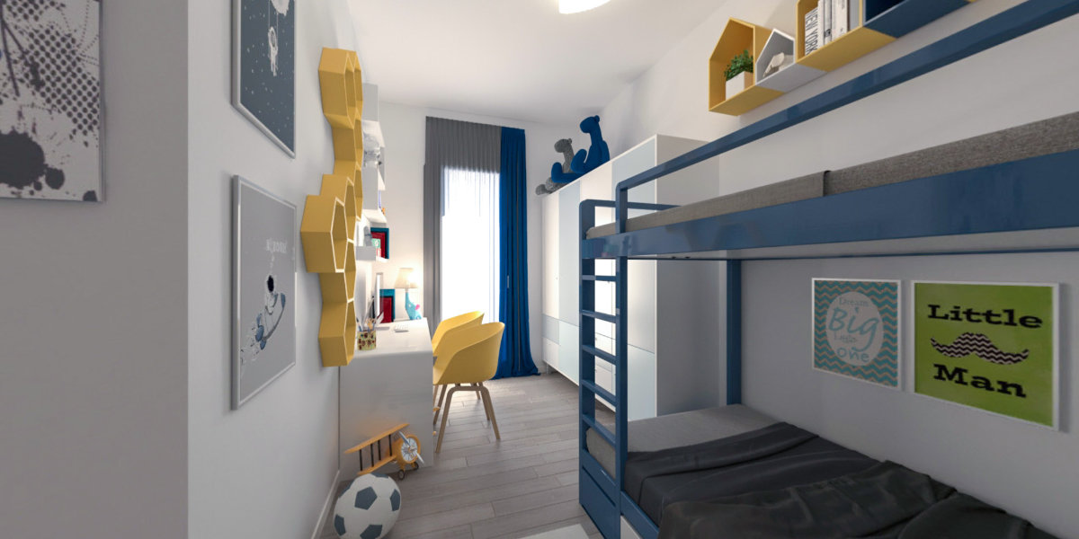 Composto da: soggiorno, cucina abitabile, ripostiglio, disimpegno, camera da letto, cameretta, due bagni, terrazzo, balcone e cantina. Disponibilità box auto.