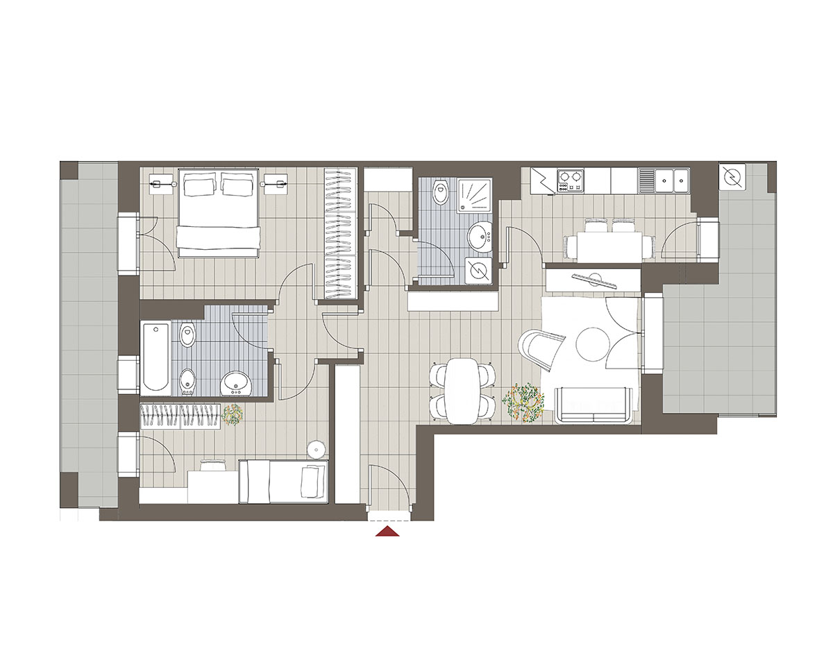 Trilocale L.2.1 di 109 mq con terrazzo e balcone.
